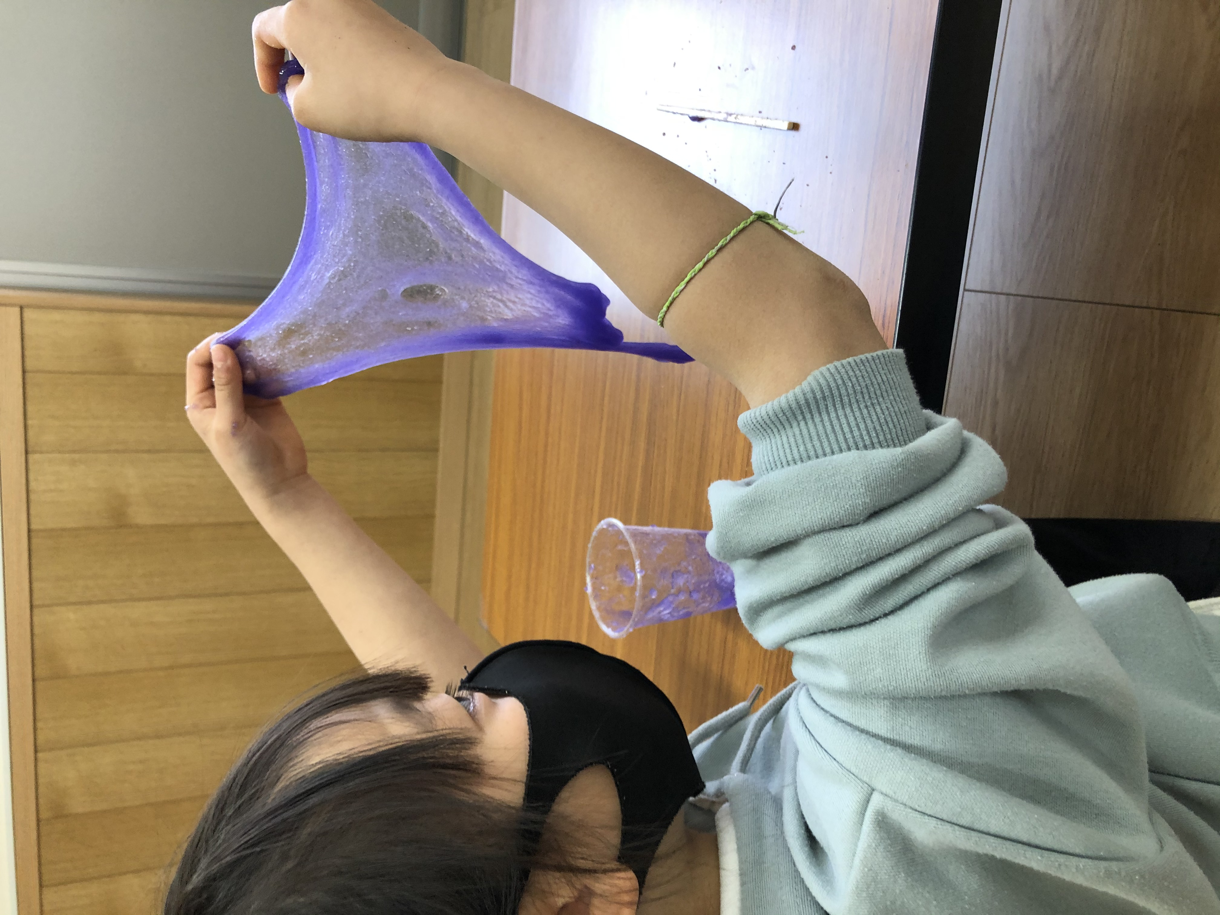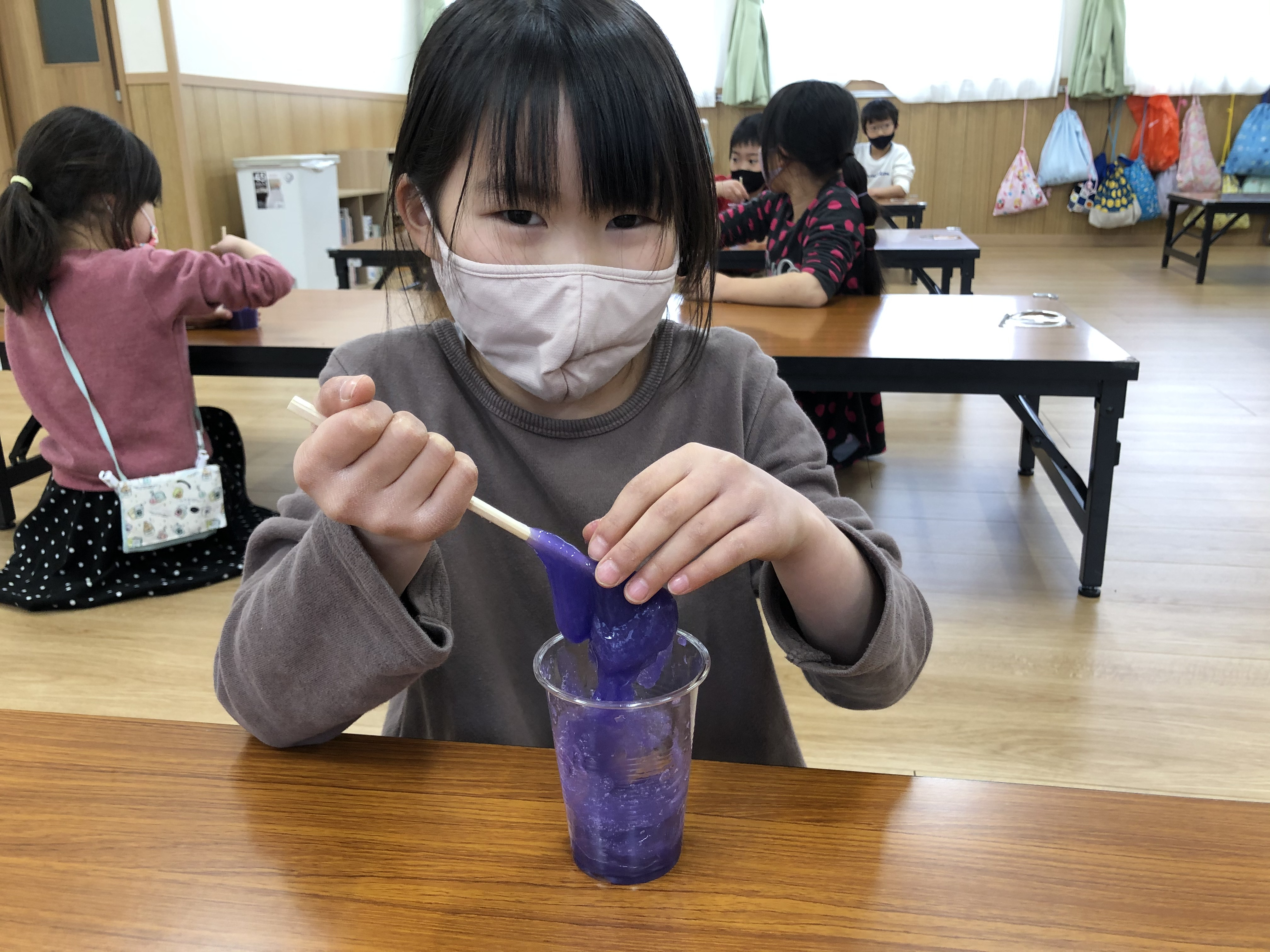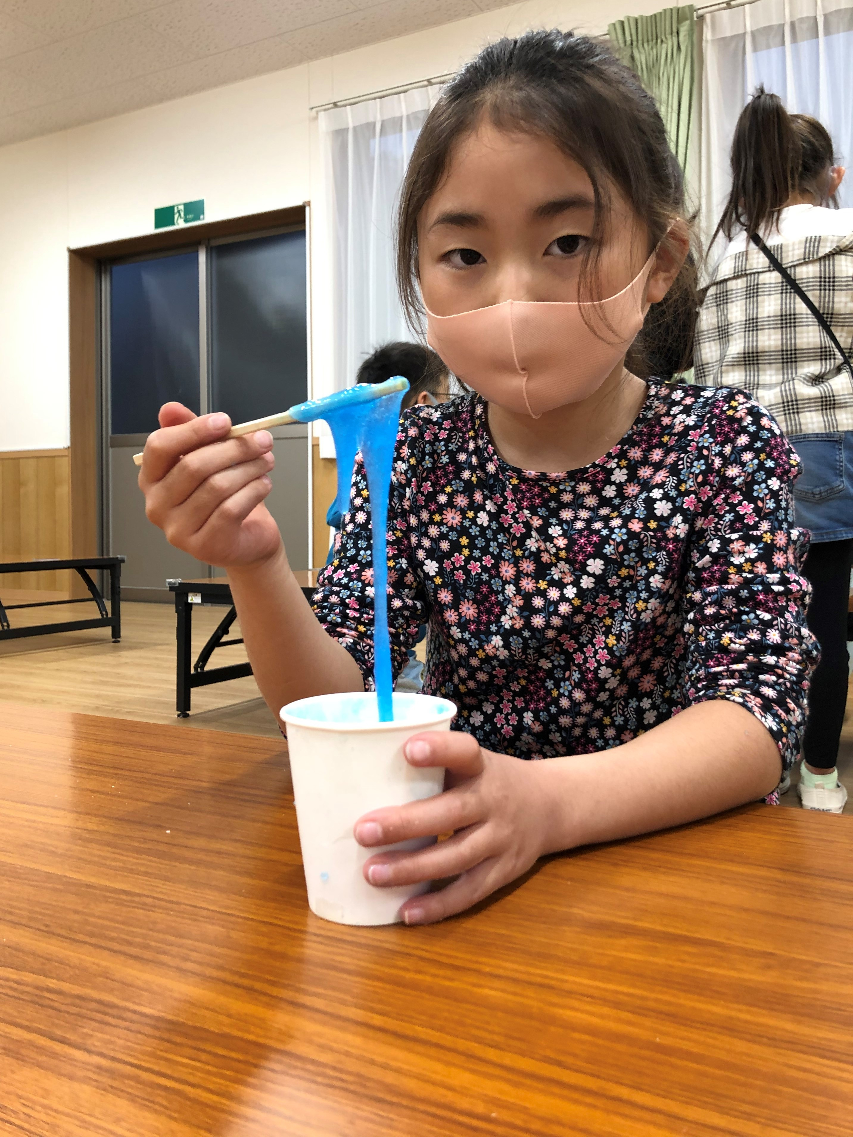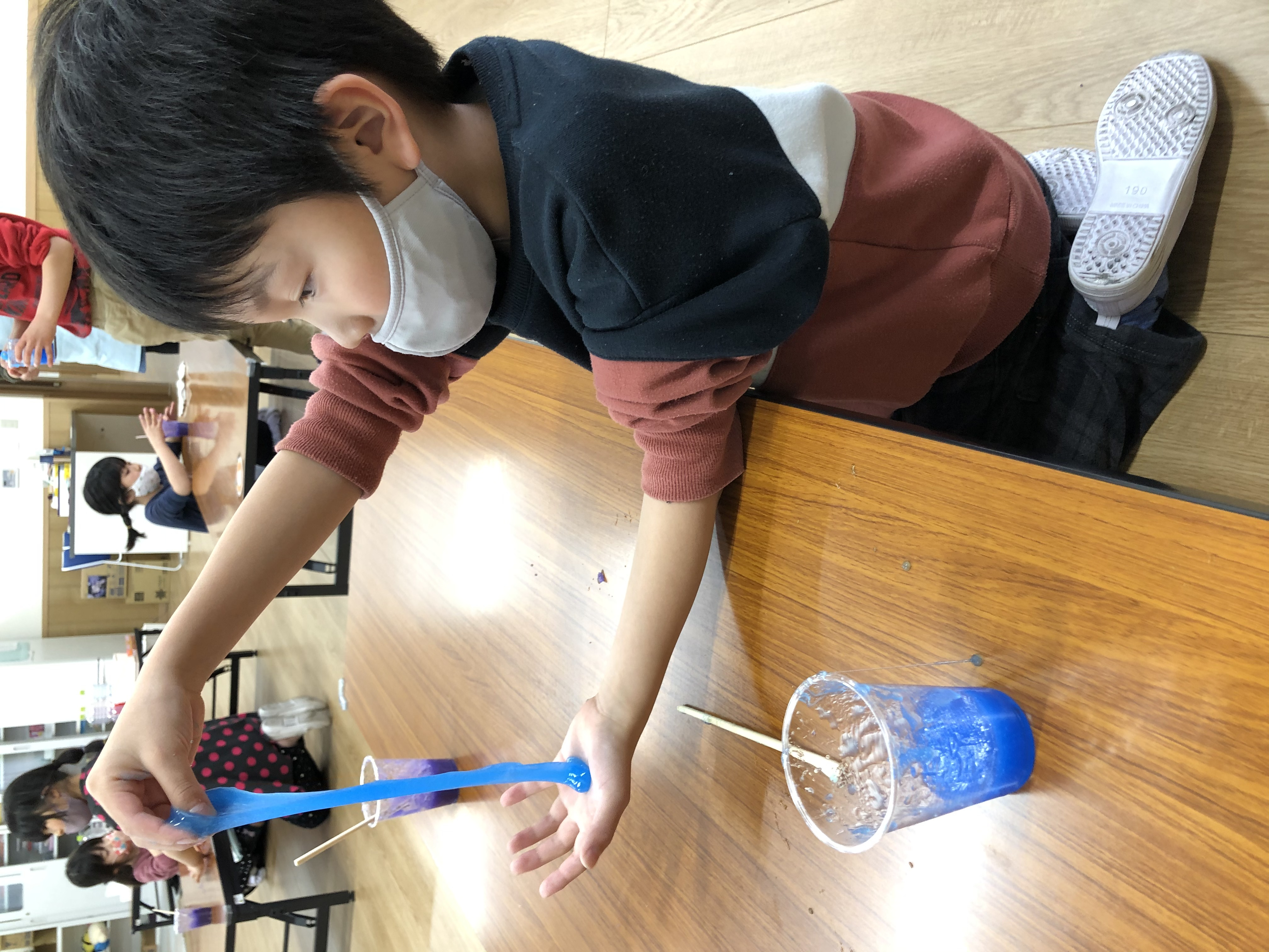 はじめはなかなか固まらず…みんなで頑張ってぐるぐる回して、ねばねばのスライムができました!