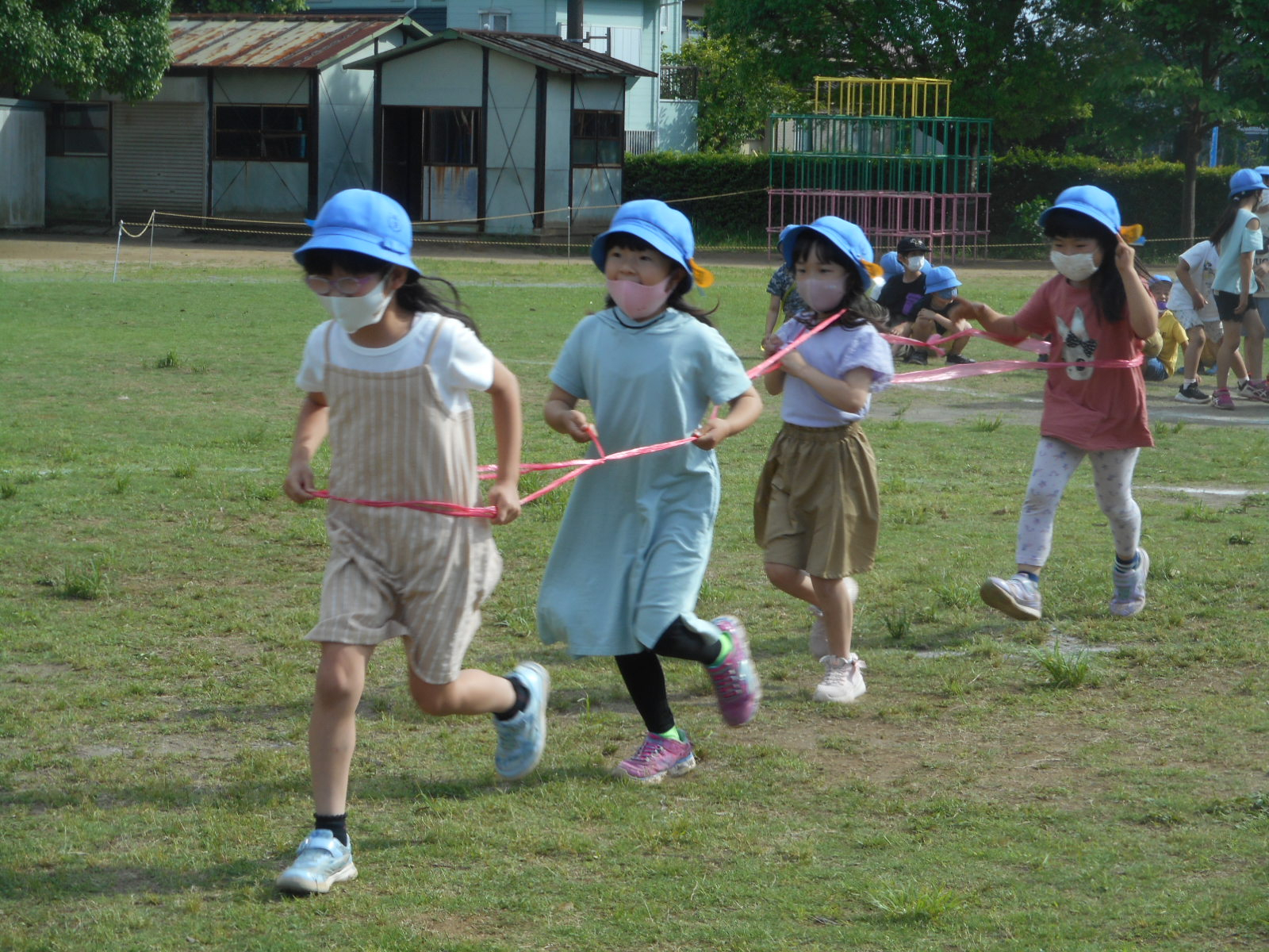 先日、1.2年生合同行事として第二青菅学童と「ムカデ競争」を行いました!