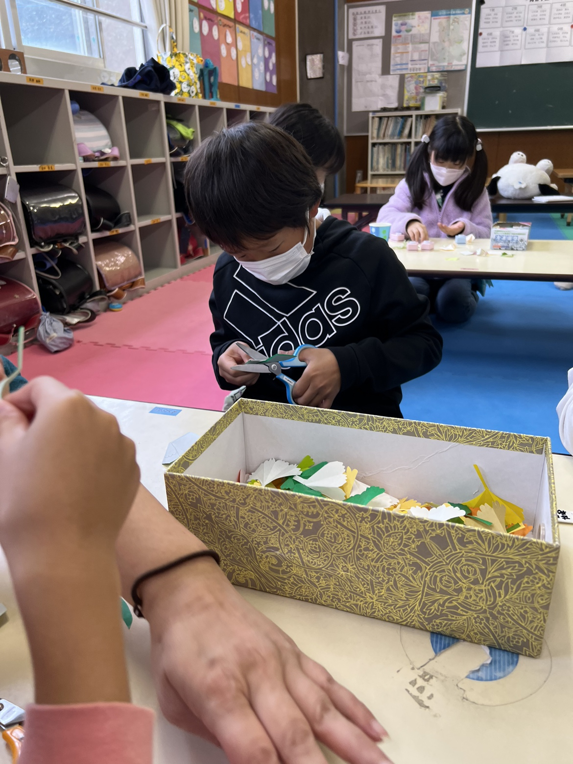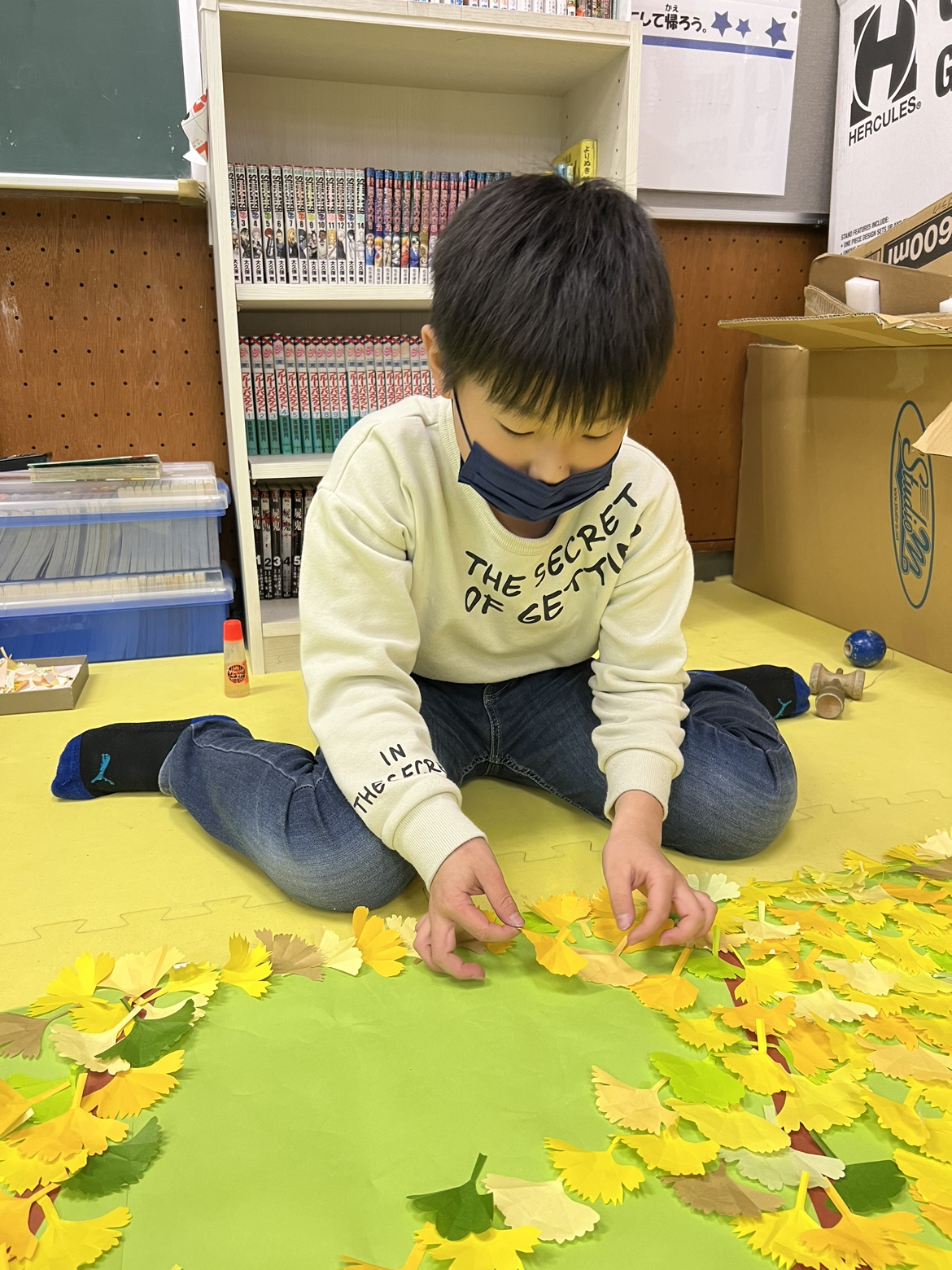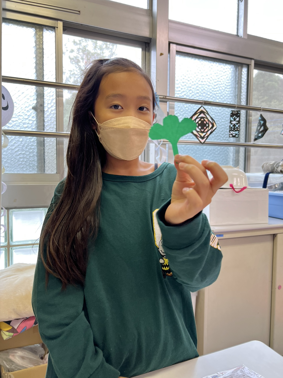 イチョウの切り紙に苦戦しながらも、「これ本物みたいでしょ!」「綺麗に切れた!」と楽しそうに製作していました。