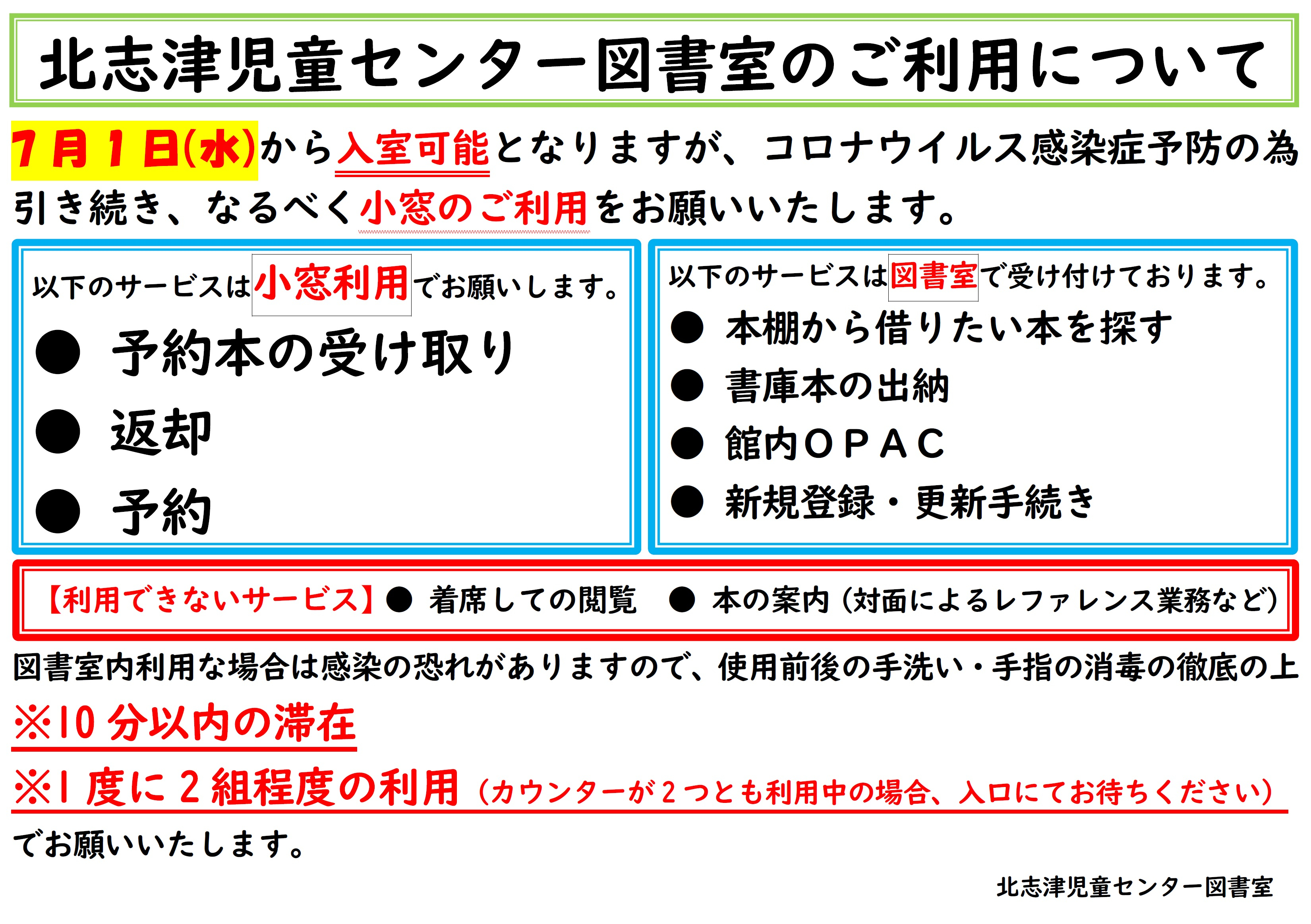2020/06/30 【重要】7月からの北志津児童センター図書室一部サービス再開について