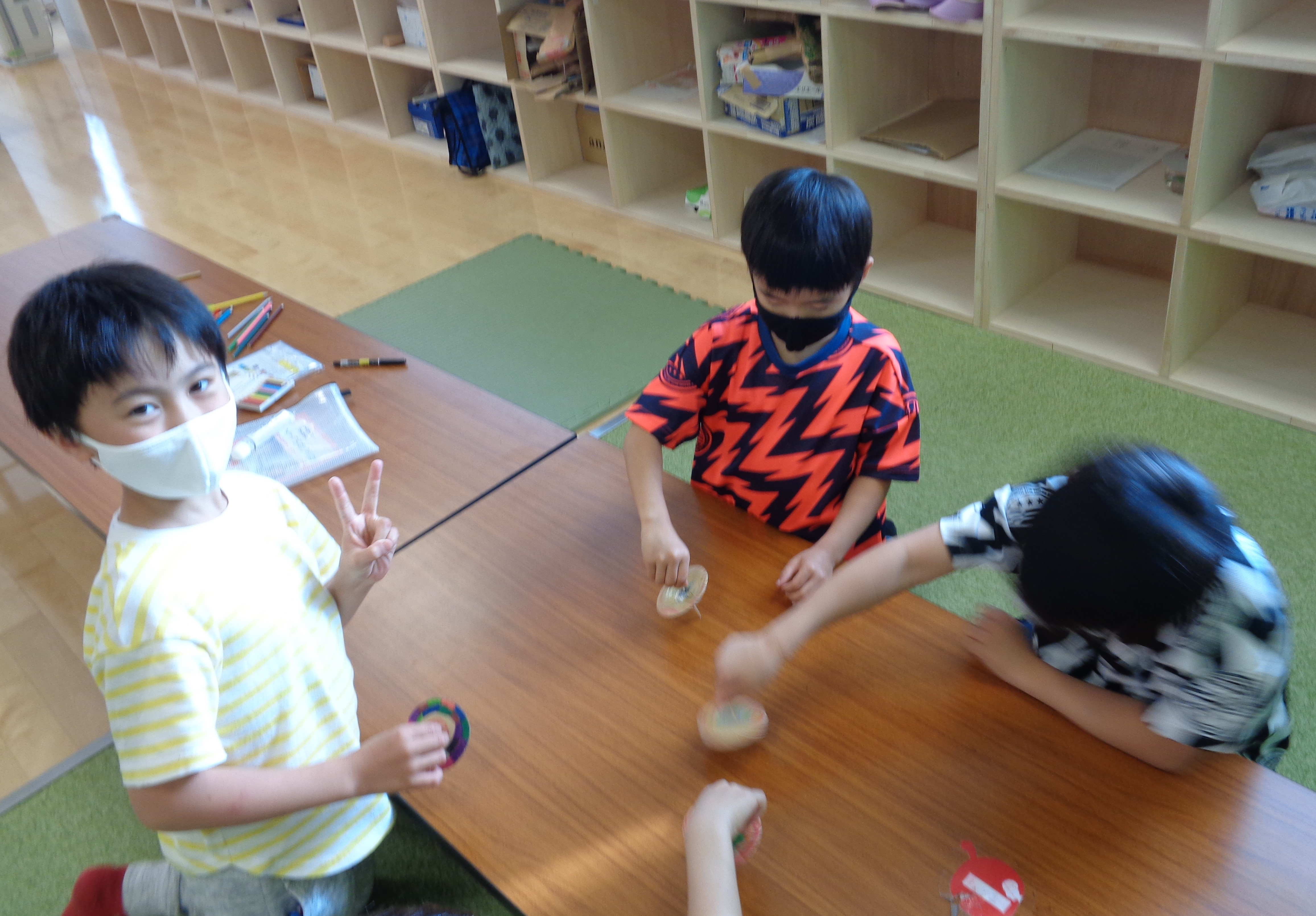 子供たちはコマに絵を描いたり折り紙を貼ったりと思い思いのコマ作りをし、コマが作り終わった子はさっそくコマ遊びをしていました。