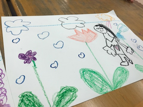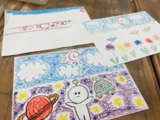 みんな一生懸命考えながら、お空や車、お花やお友だちの絵を書いていました♪