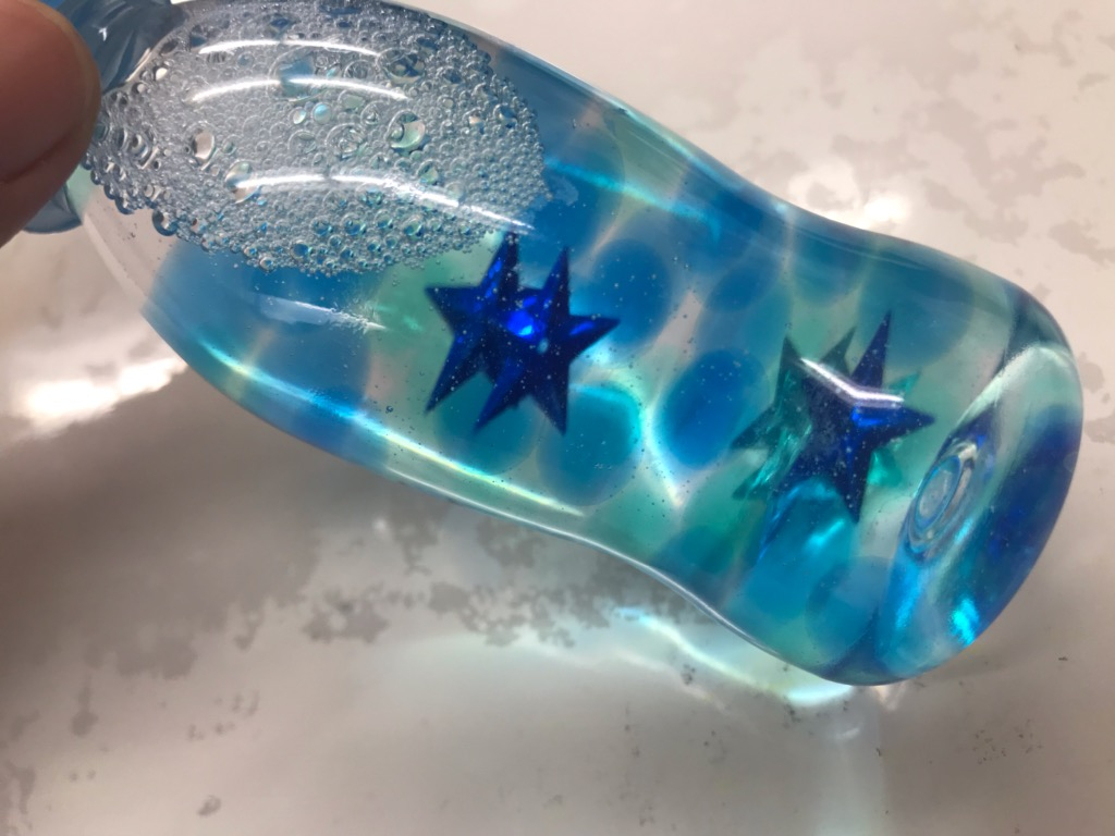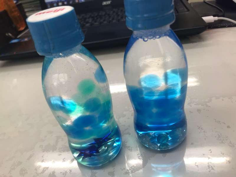 小さい空ペットボトルに好きな装飾品を入れて、洗濯のりとお水を入れただけなのですが、