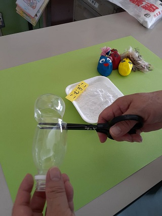 まずは、ペットボトルを上の写真のようにはさみで切って、ペットボトルの飲む場所に