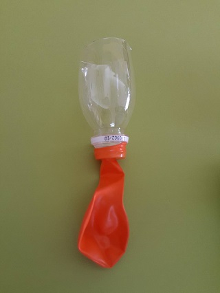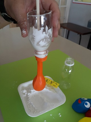 こむぎこをペットボトルに入れて、わりばしでこむぎこをふうせんに入れる。