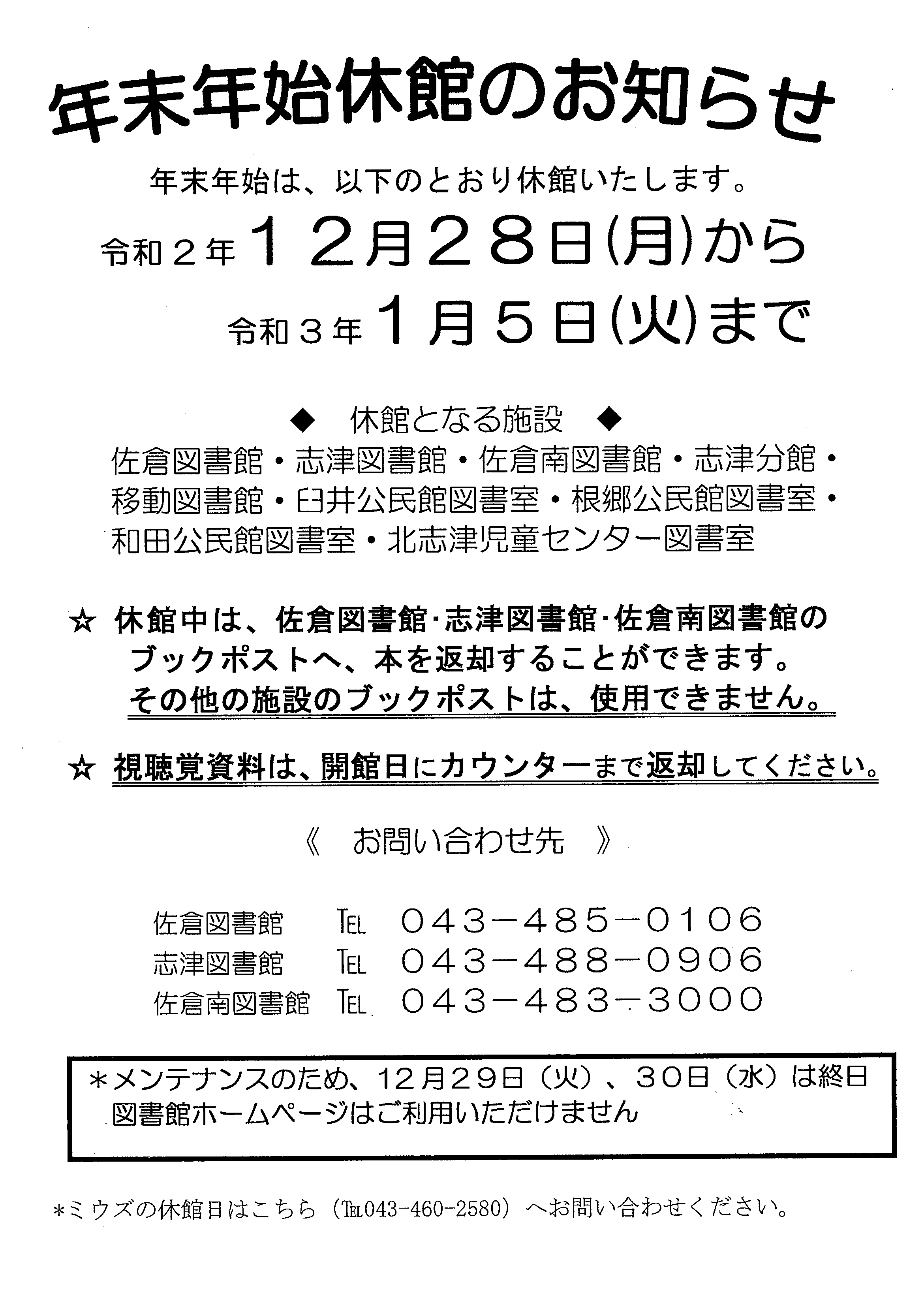 閉室中の返却は、佐倉・志津・佐倉南のブックポストにお願い致します。