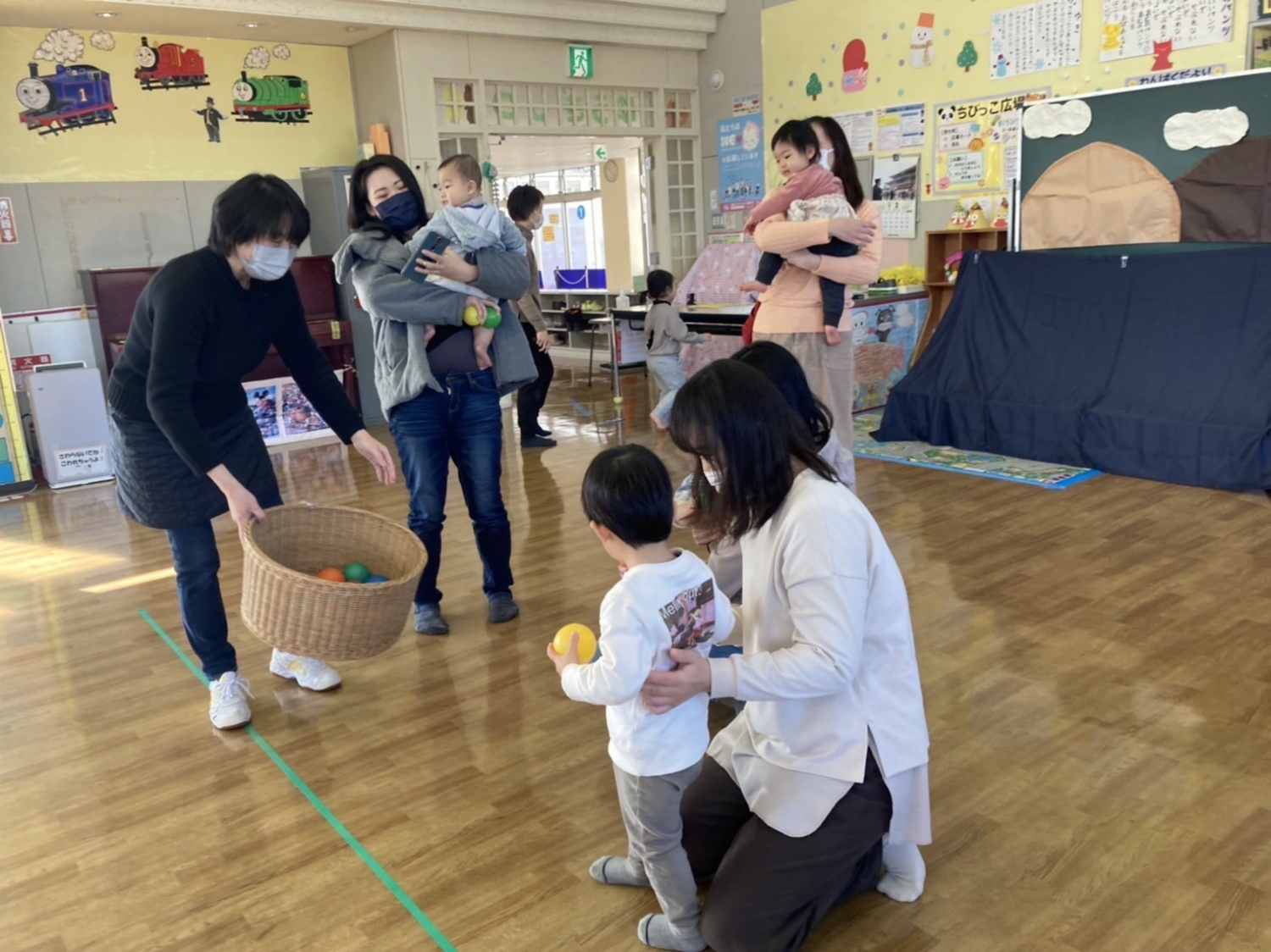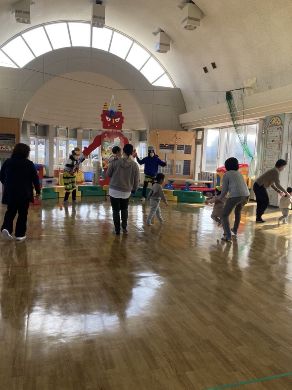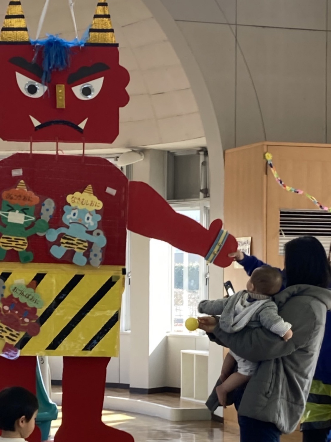 みんなで豆に見立てたボールを投げて豆まきをしたり…
