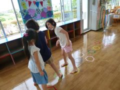 遊戯室の床にけんけんぱシールができました!