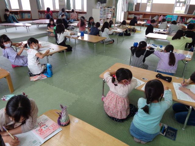 毎日の宿題を終わらせようと頑張っていますね。お絵描きや読書の他に、塾の宿題にも取り組んでいる子もいて、静かに時間を過ごすことができています!
