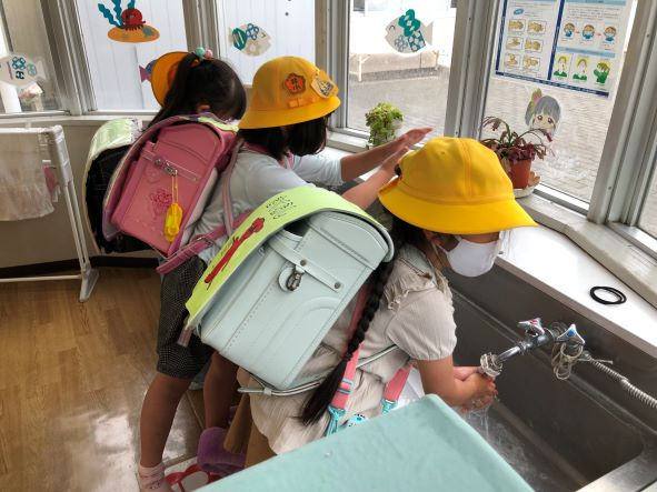 学童に来たら、まず手洗い・消毒!みんなもう慣れた手つきですね。