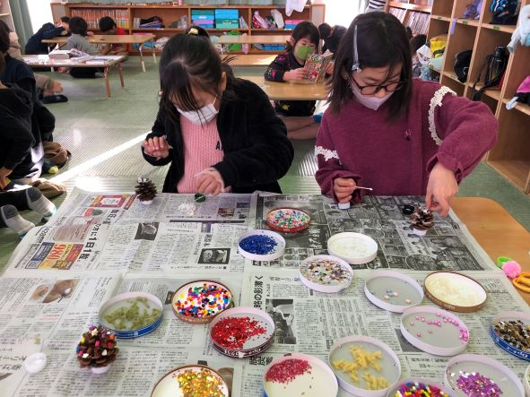 ビーズや毛糸を使って好きに飾り付けをしました。