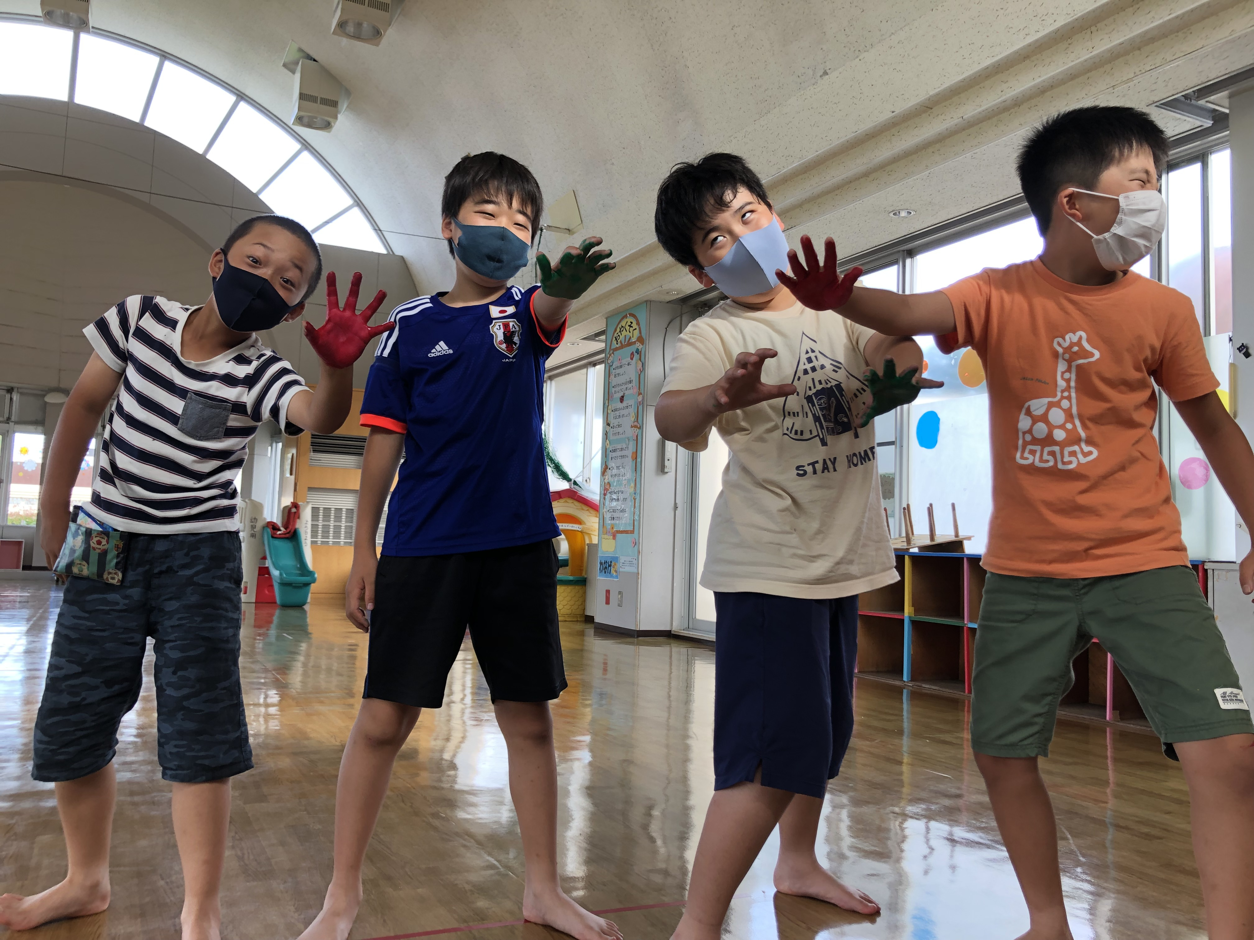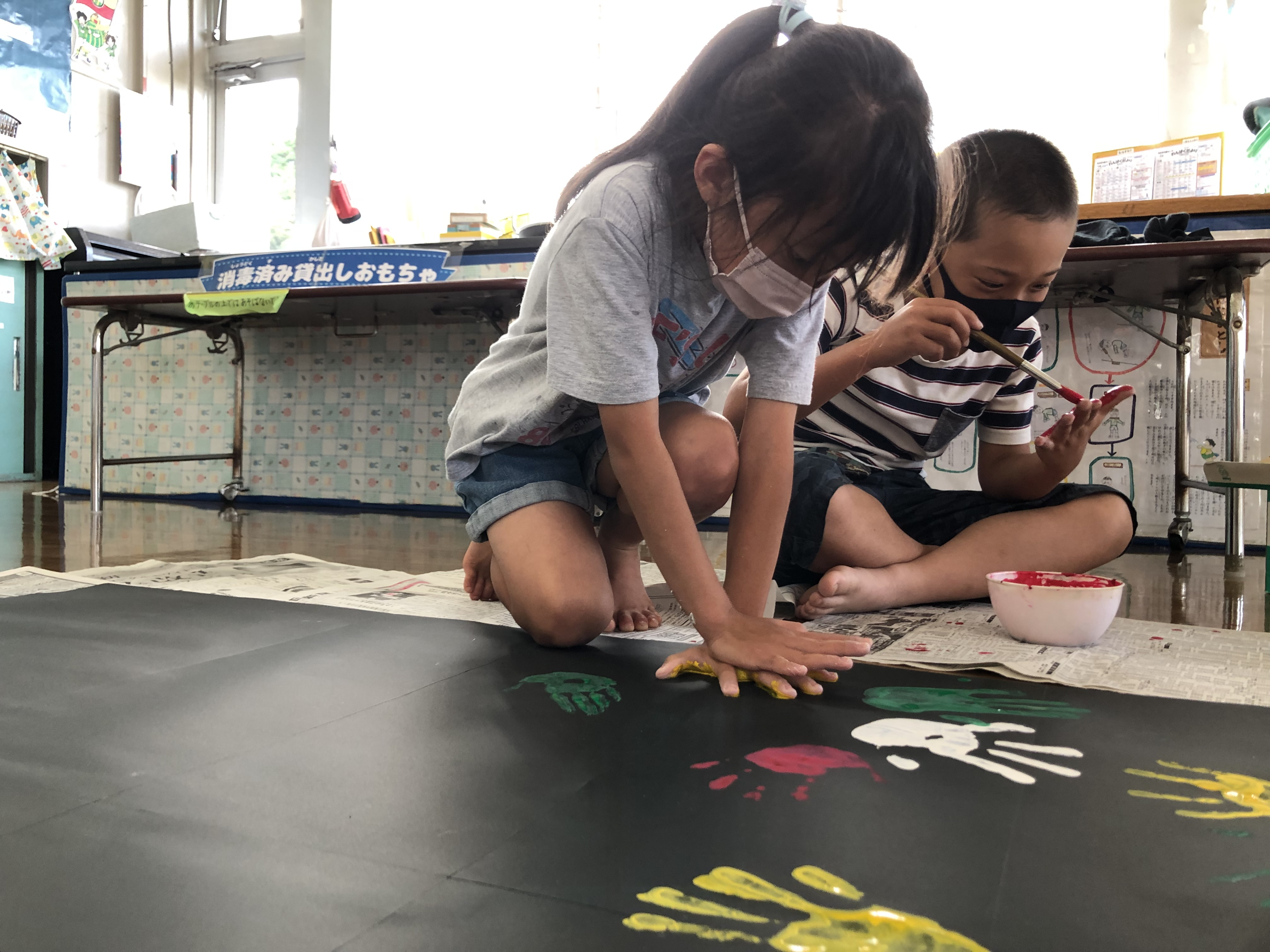 紙面にはみんなが考えて、手形だけでなく、指先で描いた模様もあります。