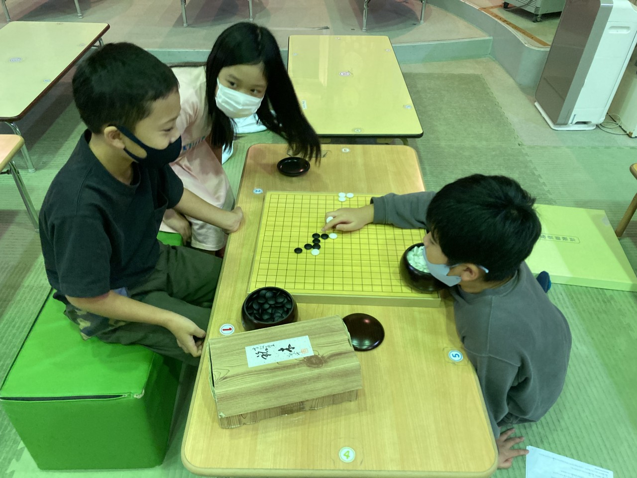 囲碁セットも最近導入され、高学年を中心にひそかなブームが起こっています。ルールの説明を印刷して一緒に置いていたら、読みながら、教え合いながら、真剣に試合を進めています…!
