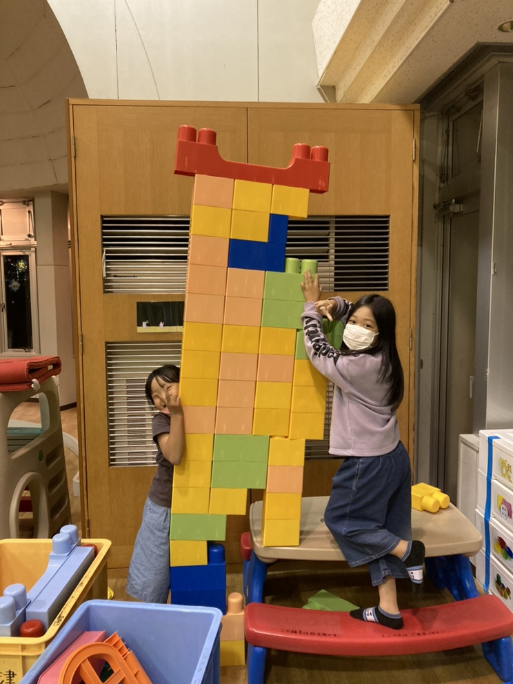 遊戯室では大きいブロックを使ったおうちづくりが人気です!たくさん積み重ねて大人の身長よりも高い建造物が作られていることも…!