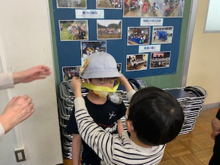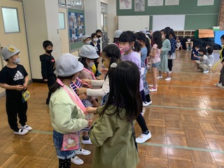 新入生の歓迎会を行いました。お兄さんやお姉さんが記念のメダルを新1年生の首にかけてあげました。