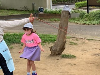 持って廊下に並びます。外に出るとそれぞれ好きな遊びをしています。時間がある日はグラウンドで遊べるよう