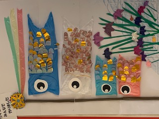 5月は、北児の壁面担当です。子どもたちと一緒に作りました。5月はこいのぼりが風に吹かれ、川沿いにあやめが