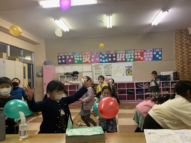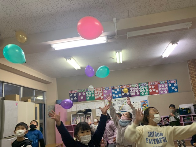 一人1個のフーセンを上げました。机をみんなで片づけ教室でポンポン飛ばして遊ぶだけですが