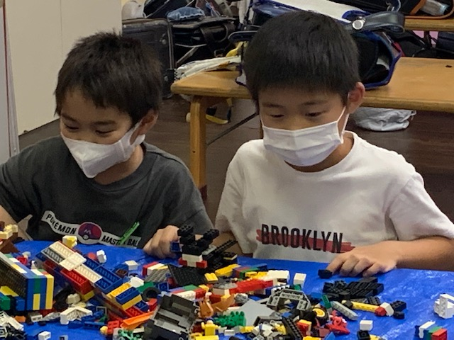 室内遊びの様子です。無限積み木を使って遊んだり、大好きなLEGOで大物を作ったり、今日は何を作るかイメージを