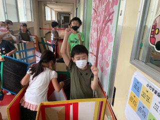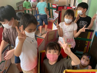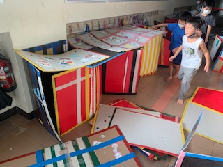 秘密基地を作りました。当日に作りリセットする、また翌日に作るの繰り返しでしたが、子どもたちは天才なので