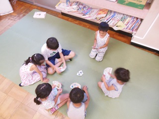 たたみ風のマットの上でお友達同士でカードゲームをしています。