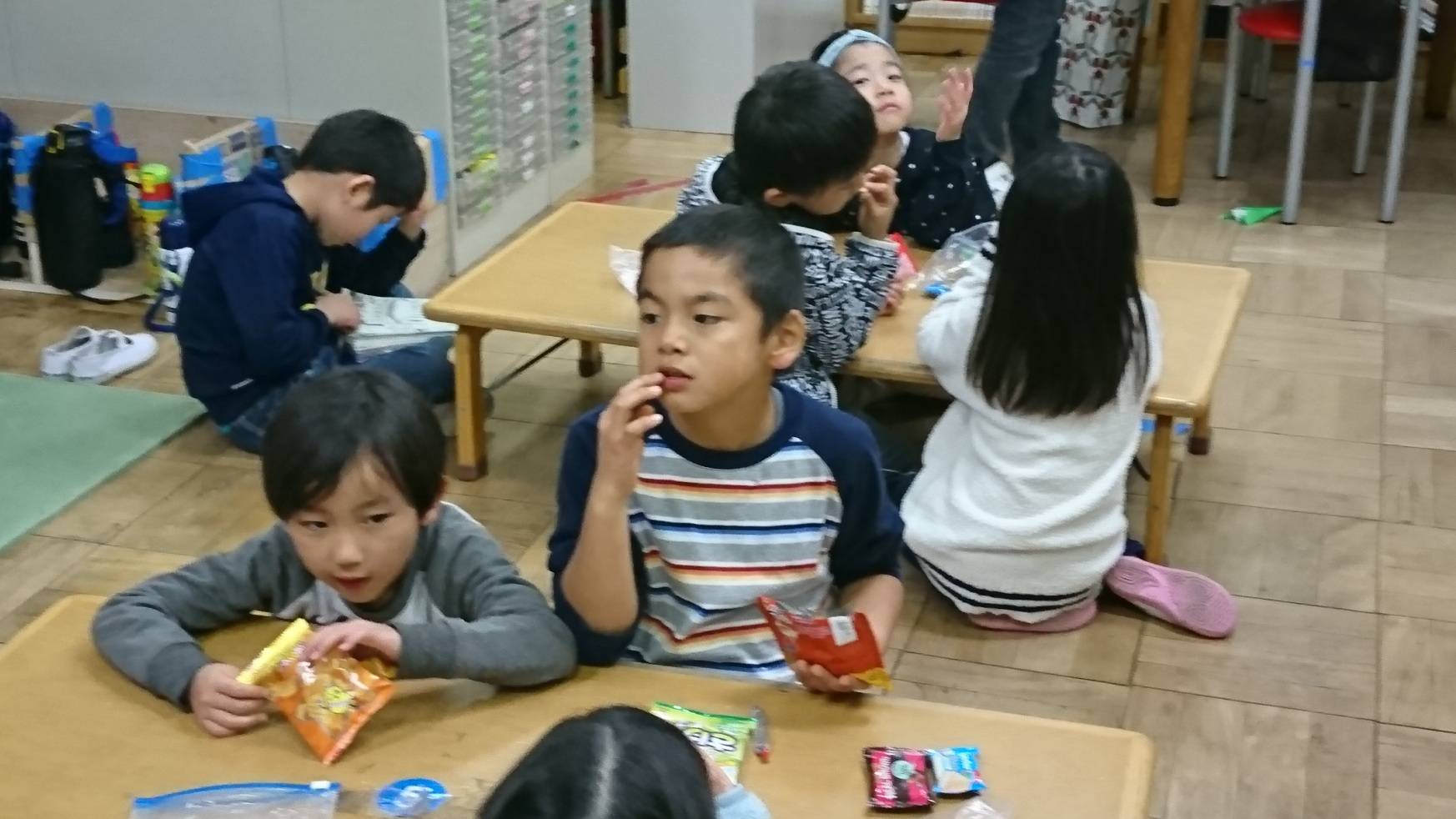 みんなおやつの時間が楽しみです。お菓子を口いっぱい詰め込むこがいますよ!