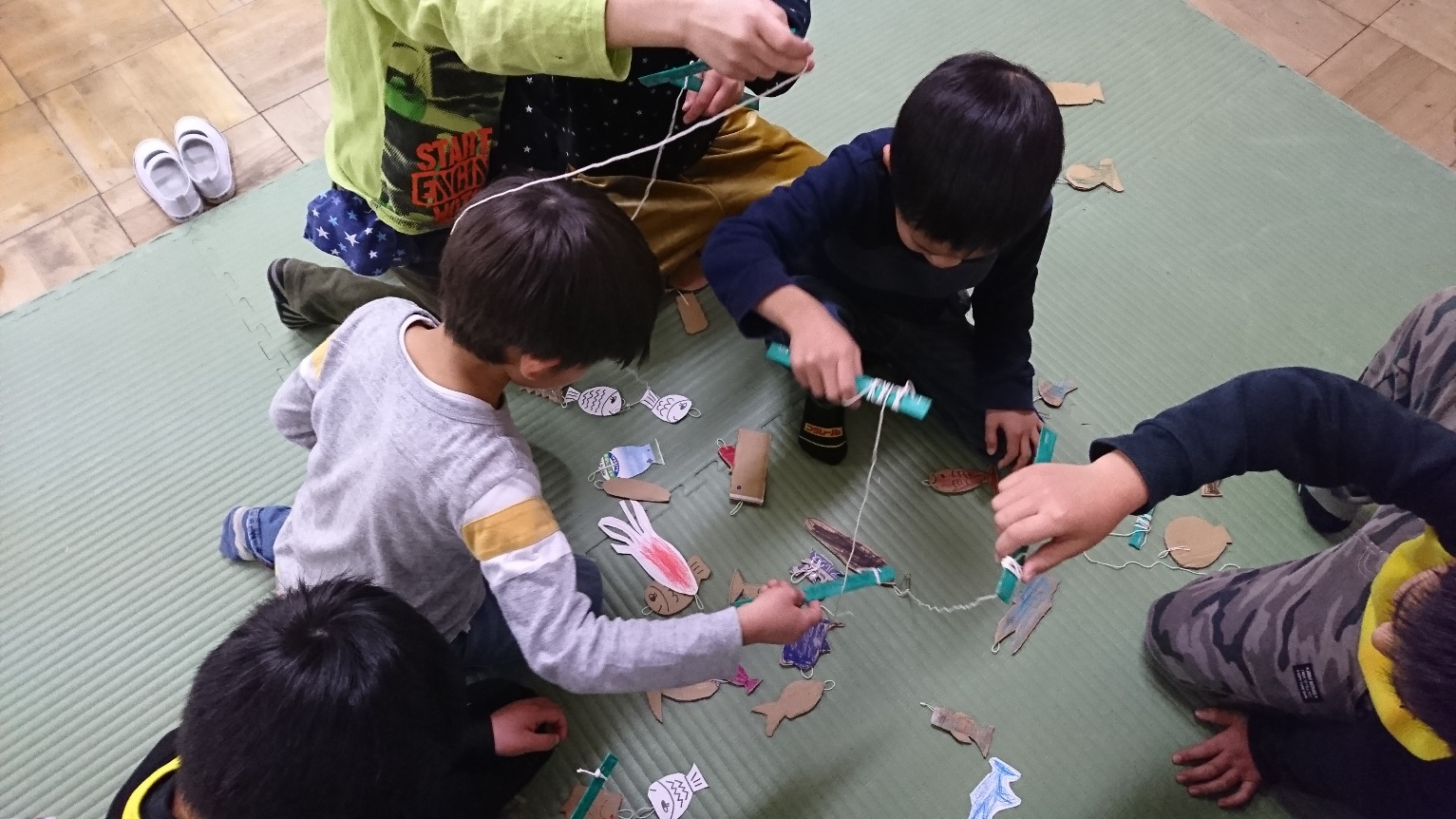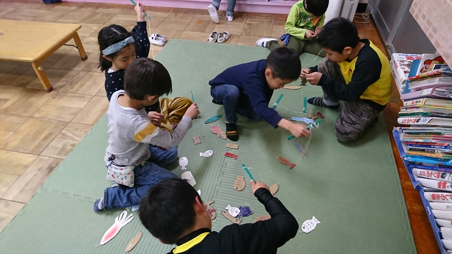 手作りの魚と釣り竿で魚釣りをやりました。1分間で何尾釣れたかを競いましたが最高が、4尾でした。中々難しかったかな?