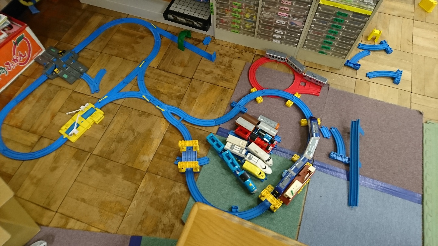 男子はプラレールにはまっています。この写真は電車が車庫に入っている様子です。