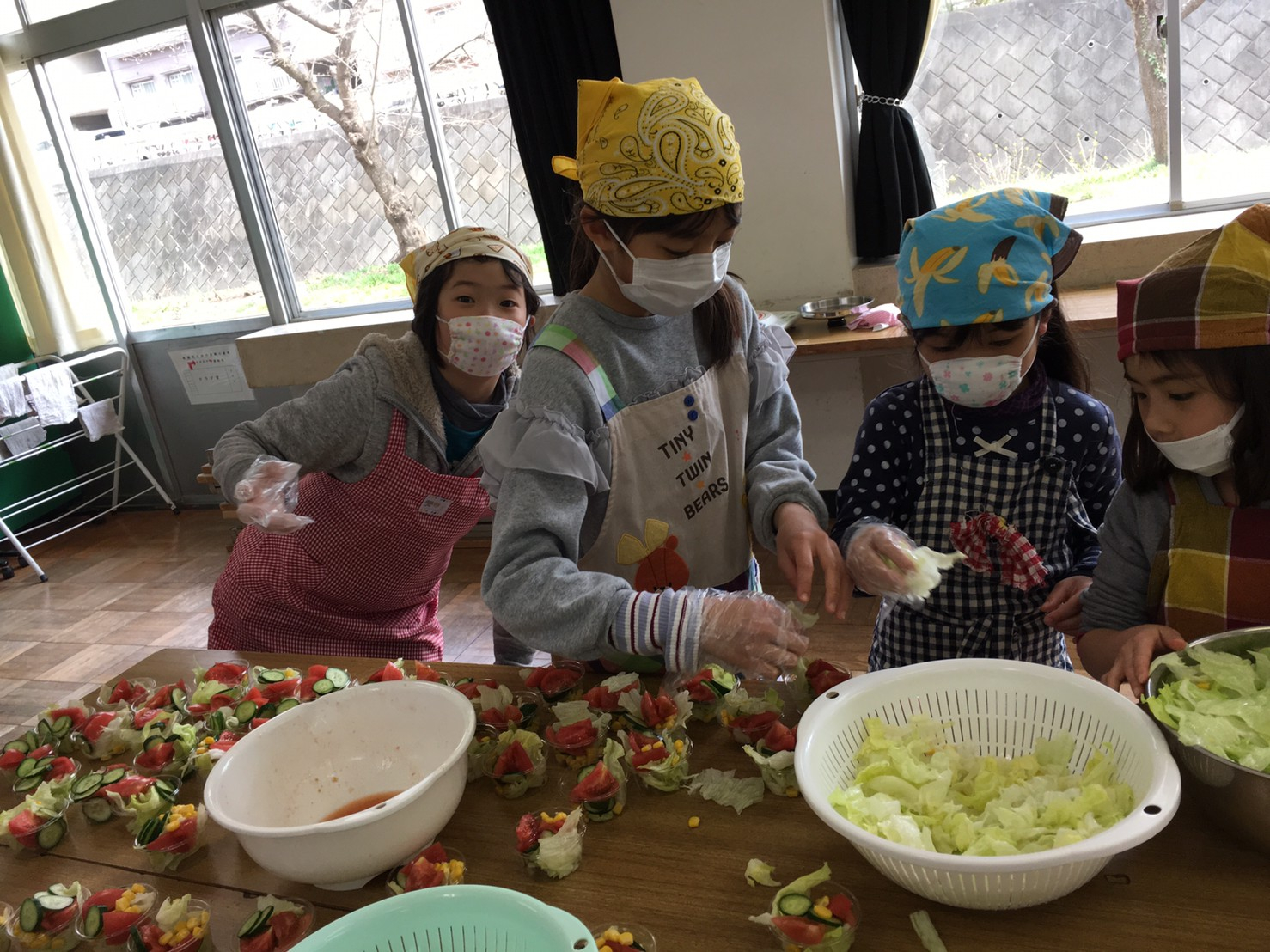 私たちはサラダ班です。みんなのサラダを盛付けしてます。 私たちはデザート班です。みんな一生懸命!
