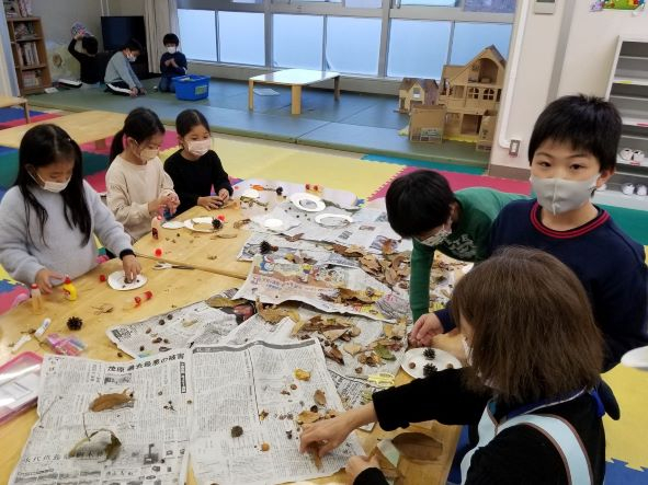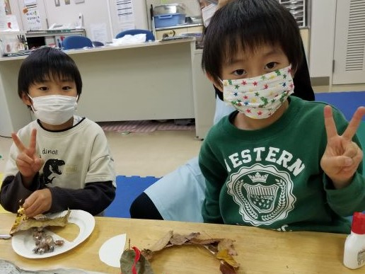 「みんなで作ろう 落ち葉工作」では、落ち葉や松ぼっくり・どんぐりを集めて工作をしました。