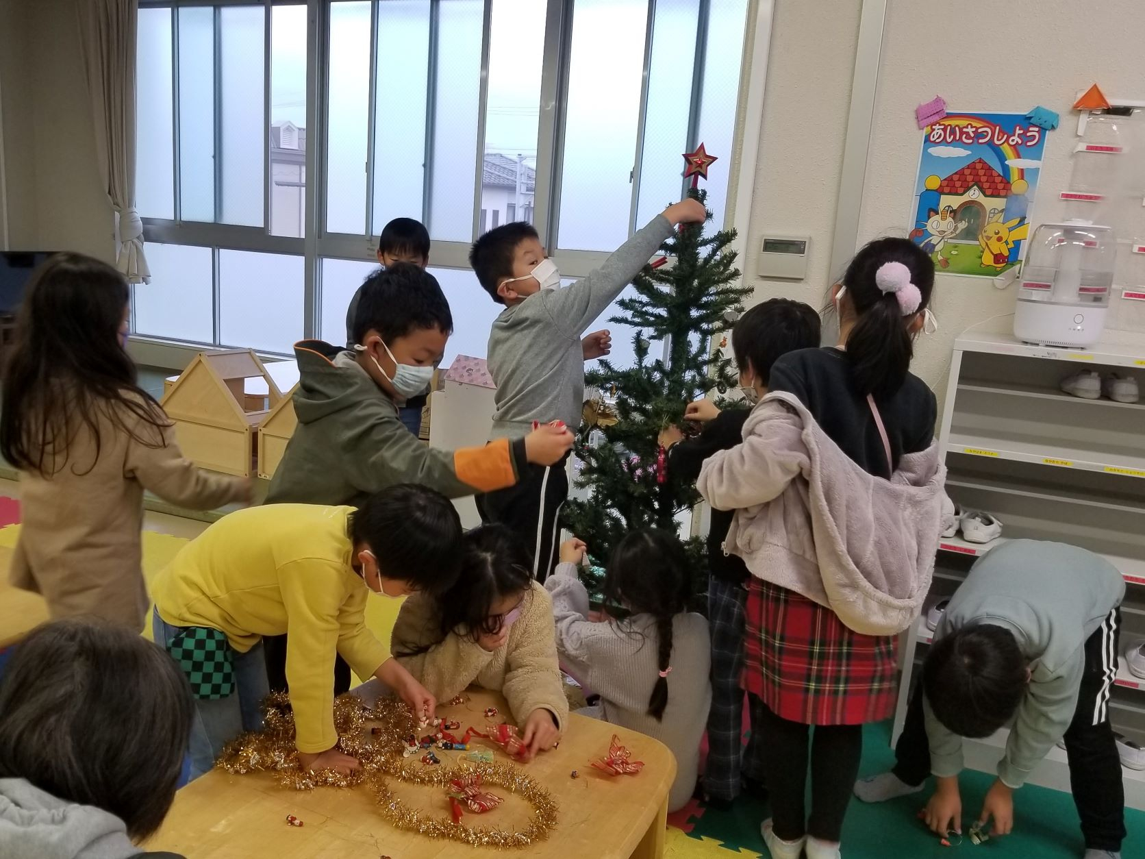 先日、クリスマスツリーの飾りつけをしました。 キラキラ光るライトに興奮気味の子供たち(笑)