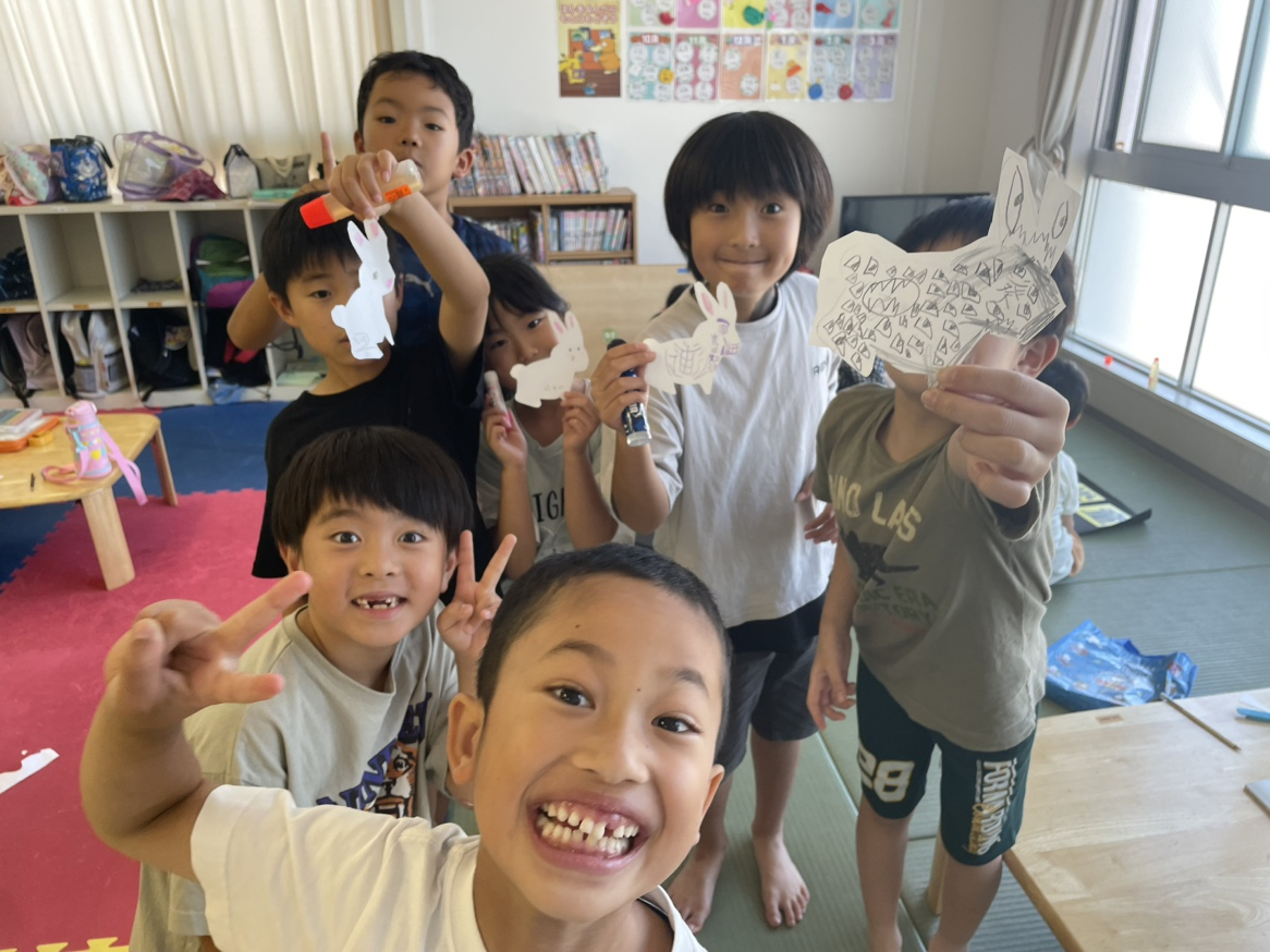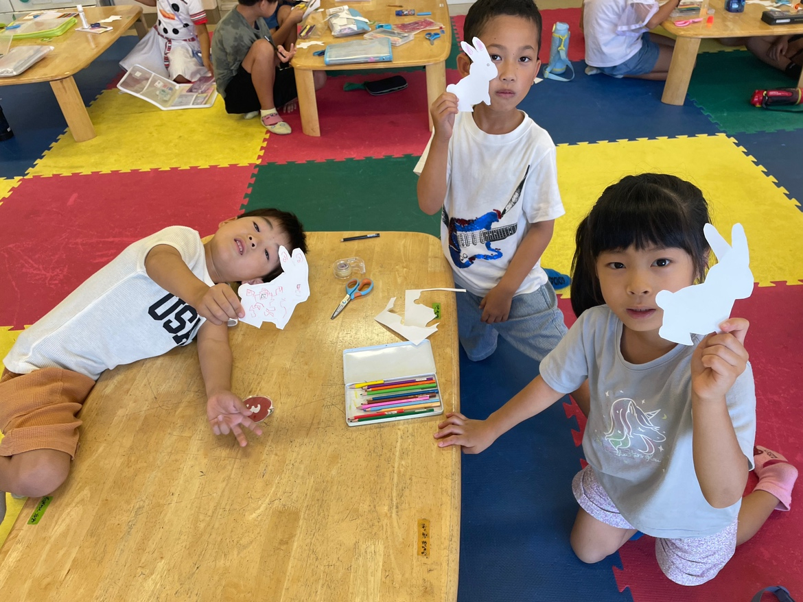 みんなでウサギを切って、顔を描いたり色を塗ってかわいく作成しました(^^♪
