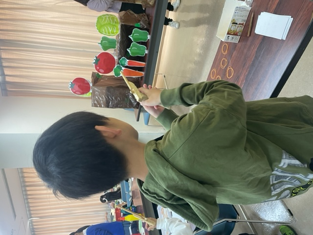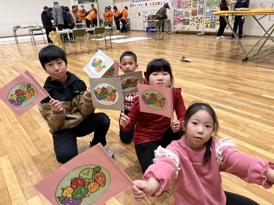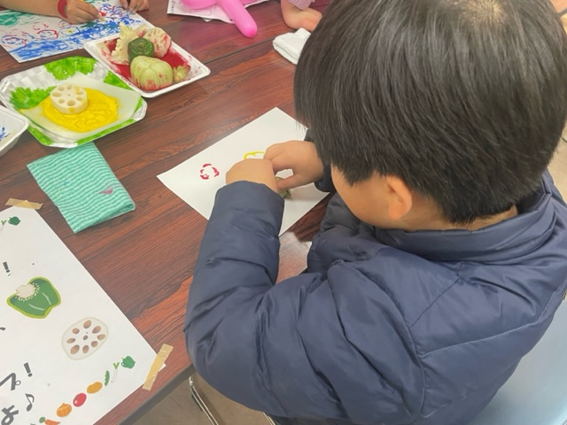 志津学童では、野菜のスタンプを体験できるブースを開き、子どもたちは生の野菜でスタンプを押せることにワクワクした様子でした。