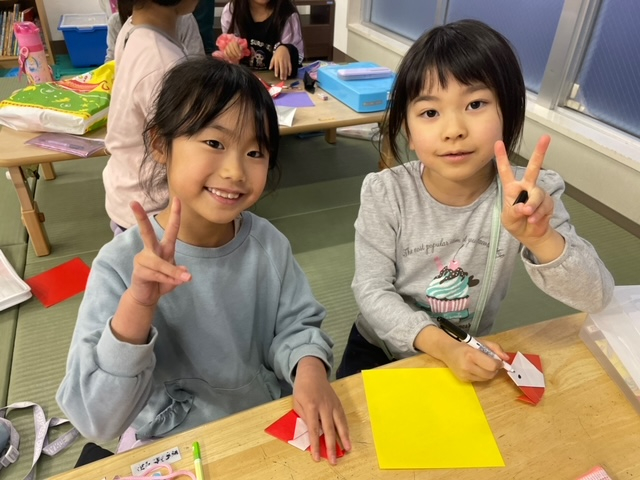 折り紙が得意な子は、プレゼント箱やハート、リボンを折って、みんなで楽しく作ることが出来ました♪
