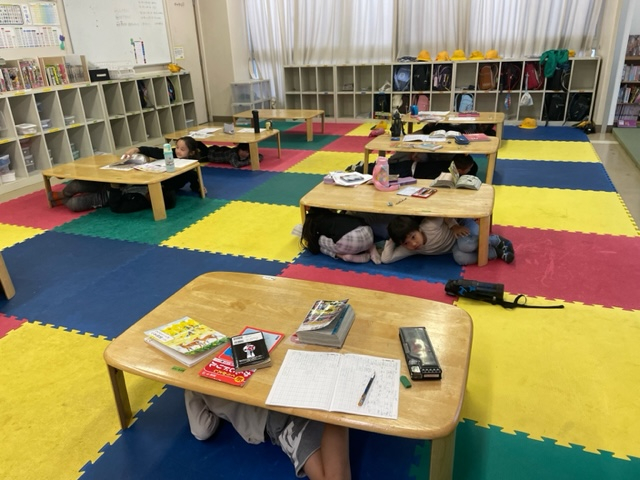 笛の合図で、子どもたちはいっせいに机の下に避難しました!